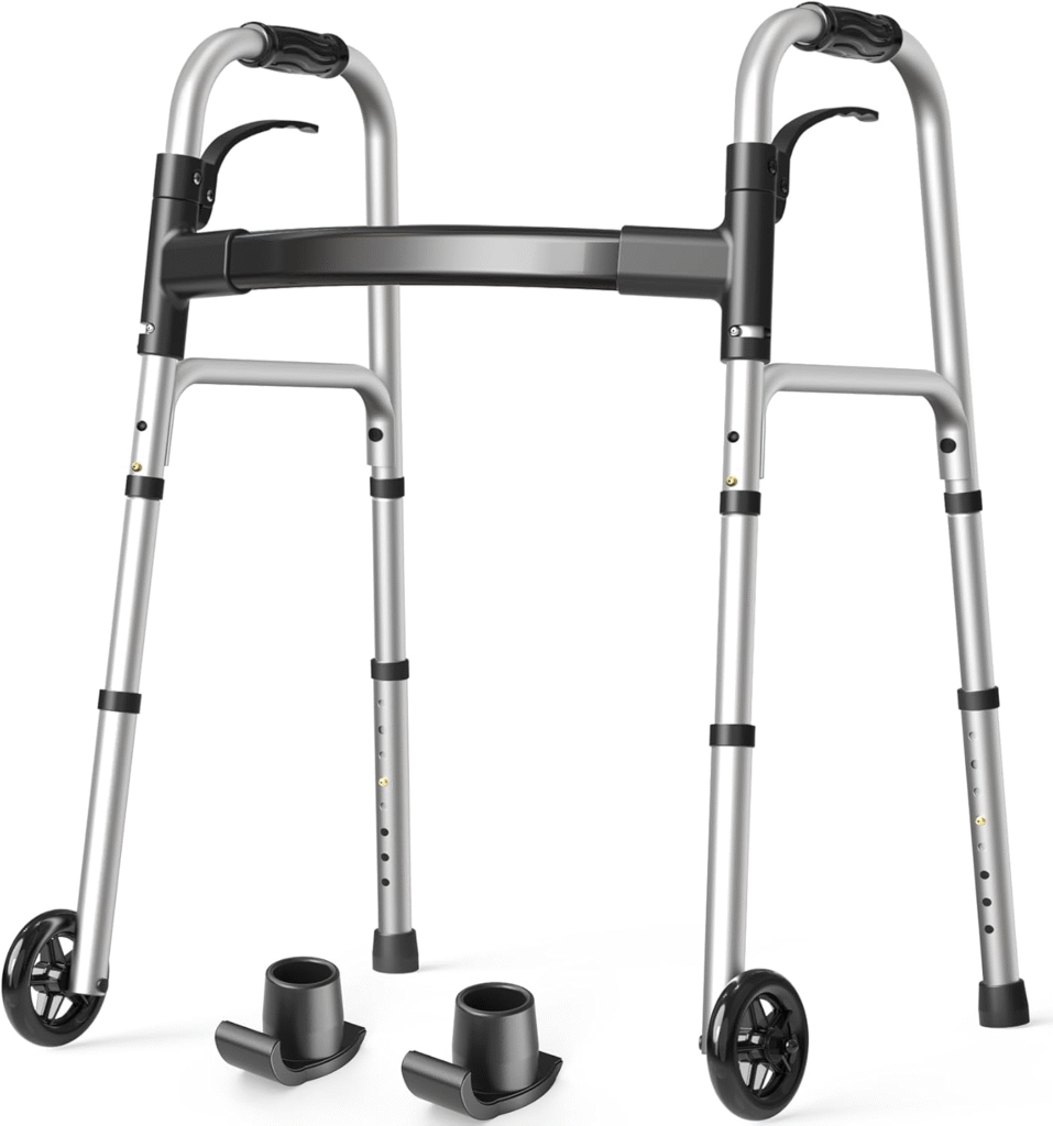 The Loyoda Folding Walker with Wheels is a lightweight aluminum mobility aid for seniors and adults. It includes 5-inch front wheels and ski glides for smoother indoor walking.