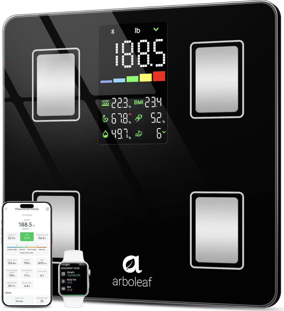 This Etekcity smart scale provides full-body composition analysis including fat %, muscle, and bone mass.
