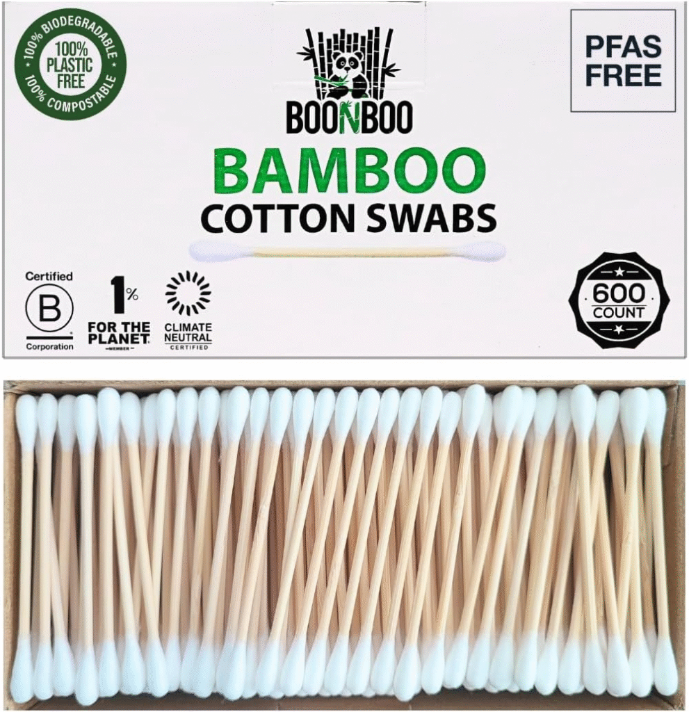 The BOONBOO Organic Bamboo Swabs combine luxury and sustainability. Each stick is FSC-certified bamboo, and the tips are organic cotton, soft enough for sensitive skin and baby care. They’re PFAS-free, BPA-free, and cruelty-free — perfect for health-conscious families.